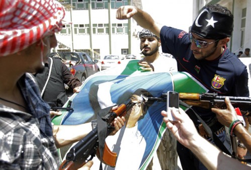 The Libyan Revolution in particular vividly illustrates that the defacing of a dictator’s image holds, in itself, a political power protestors appear to tap into. A recent news photograph depicts rebels as they poke their guns into a Gaddafi poster. The gun penetrating the surface of the poster is symbolical for the rebels penetrating the instruments of power of the regime in Tripoli. Importantly, in the photograph a hand holding a mobile phone can be seen reaching into the image. The mobile phone is recording an action which is similarly performed all over liberated parts of the country. The defacing of the poster is not simply an action worth recording on the mobile phone, or, by extension the news photographer on site, but also, it becomes a recognisable gesture symbolising the eventual toppling of Gaddafi himself.
