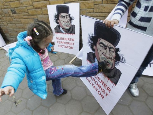 Another news photograph depicts a little girl as she is kicking a drawing of Gaddafi. A reading of the photograph suggests that while the little girl is not participating in the armed uprising as such, she is, symbolically, standing up against his tyranny. The defacement of Gaddafi thus becomes a gesture that is not exclusive to those participating in the armed struggle. In the photograph, like in many other similar photographs, the physical contact between the shoes and Gaddafi’s face connote the ultimate insult in Arab culture as George W. Bush once famously dodged shoes at a press conference in Baghdad.