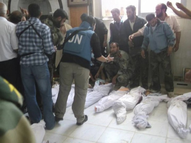 UN observers examine bodies at a hospital morgue in the Syrian town of Houla before their burial, May 26 2012. (AFP/Shaam News Network)