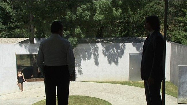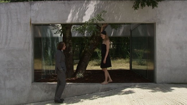 In spite of representing fractured and corrupt relationships, the video is shot with subtlety and rhythm. The physical presentation of the video too, projected on the back of a semi-transparent white screen, adds to an extremely aesthetic experience. The lush greenery of the west coast of France juxtaposed with the harsh linear structures of the modernist building are thus not only projected on the white screen, but also, they are projected through the screen into the room of the gallery. The viewer, too, inadvertently becomes a temporal screen in Claerbout’s carefully considered set up.