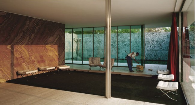 Another modernist building is the main set for a video piece titled Sunrise. Here, the viewer follows a cleaner who enters the residential building in near-total darkness to begin her shift. To avoid disturbing the owner of the house who is still sleeping, the cleaner conducts her job in darkness and as silently as possible. The owner of the house, one can assume, is a pedantic person who likes to wake up in a clean and tidy environment. Comparing Claerbout’s video with a photograph, Sunrise is perhaps the nocturnal video version of Jeff Wall’s Morning Cleaning photographed at Mies van der Rohe’s Barcelona Pavilion.