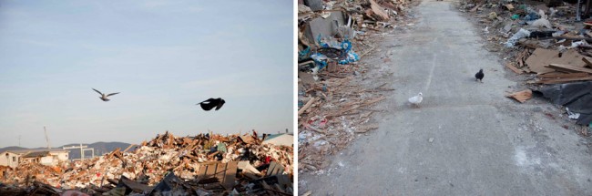 The photographer Rinko Kawauchi also travelled to the effected regions on the east coast of Japan. Her previous photographic works are characterized by astute and subtle observations of the every day. Rather than solely training her camera on the destruction caused by the tsunami, Kawauchi noticed a pair of domesticated pigeons who always returned to the same place in one coastal town. Guided by the navigational instincts, the pigeons habitually returned to the place that they new best yet that no longer existed. In as much the Tōhoku represents destruction on an unimaginable scale, Kawauchi’s photographs also signify a sense of renewal.