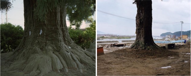 I only realised later that Rikuzentakata is also the hometown of the photographer Naoya Hatakayema. By mere chance, Hatakeyama embarked on a longterm project in 2002, capturing the town’s close spiritual association with the sea. In one image taken before the tsunami, Hatakeyama photographed a tree with gohei, or wooden wands with paper streamers used in Shinto rituals, which were meant to purify the tree from the spirits. On his return to Rikuzentakata, the massive tree withstood the forces of the tsunami while the destruction of the town is clearly visible in the background to the photograph. Hatakeyama’s personal connection to this place thus resulted in an eerie set of images that capture the town before and after the disaster. His photographs ultimately depict the landscape as a complex set of binary opposites: the past and the present, a once safe place now destroyed.