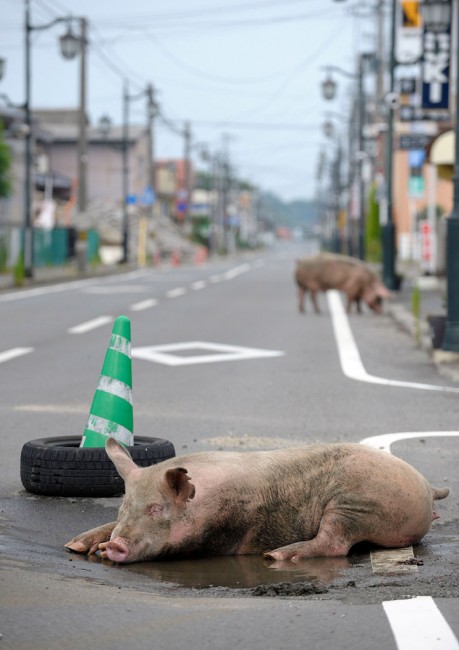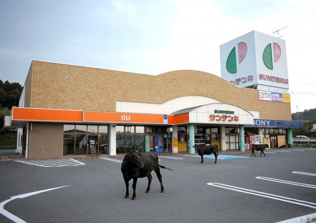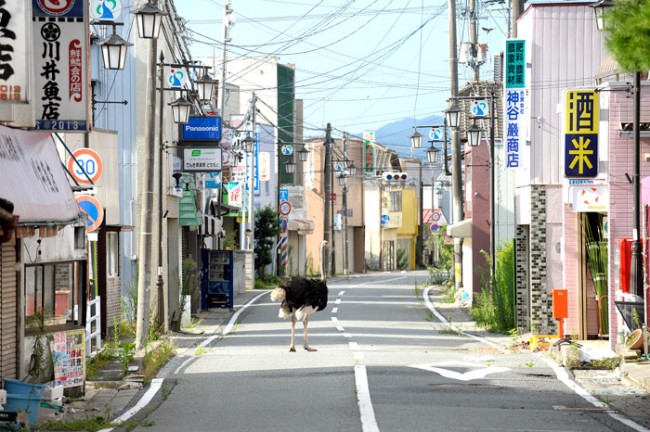 One of the most surreal yet also touching photographic works to have been produced in the aftermath of the earthquake and tsunami is Yasusuke Ota’s project The Abandoned Animals of Fukushima. A day after the tsunami damaged a nuclear reactor at Fukushima, those living within 20km of the power plant were forcibly evacuated by the government. In fear of nuclear contamination, inhabitants had to leave their personal belongings, as well as pets and farm animals behind. Two weeks after the evacuation took place, Ota volunteered to enter the ‘no go’ area to provide these animals with food and water. What Ota found were amazingly surreal scenes that could have featured in post-apocalyptic films such as I am Legend: an ostrich that escaped from a nearby farm roaming the streets of Okuma Machi, a bunch of cows apparently lost and confused on a parking lot in Tomioka Machi, and, perhaps most bizarrely, pigs trying to cool their bodies in a puddle on the streets of Namie Machi. Ota’s photographic project adds another dimension to our perception of the 2011 Tōhoku earthquake and tsunami as the roaming animals create a surreal contrast to a place in which life, it appears in the photographs, has otherwise stood still.